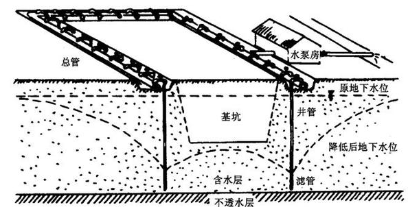 (6)井點降水若與明溝排水相結(jié)合并將總管安裝在原地下水位線以下或采用二級輕型井點可進一步增加降水深度。