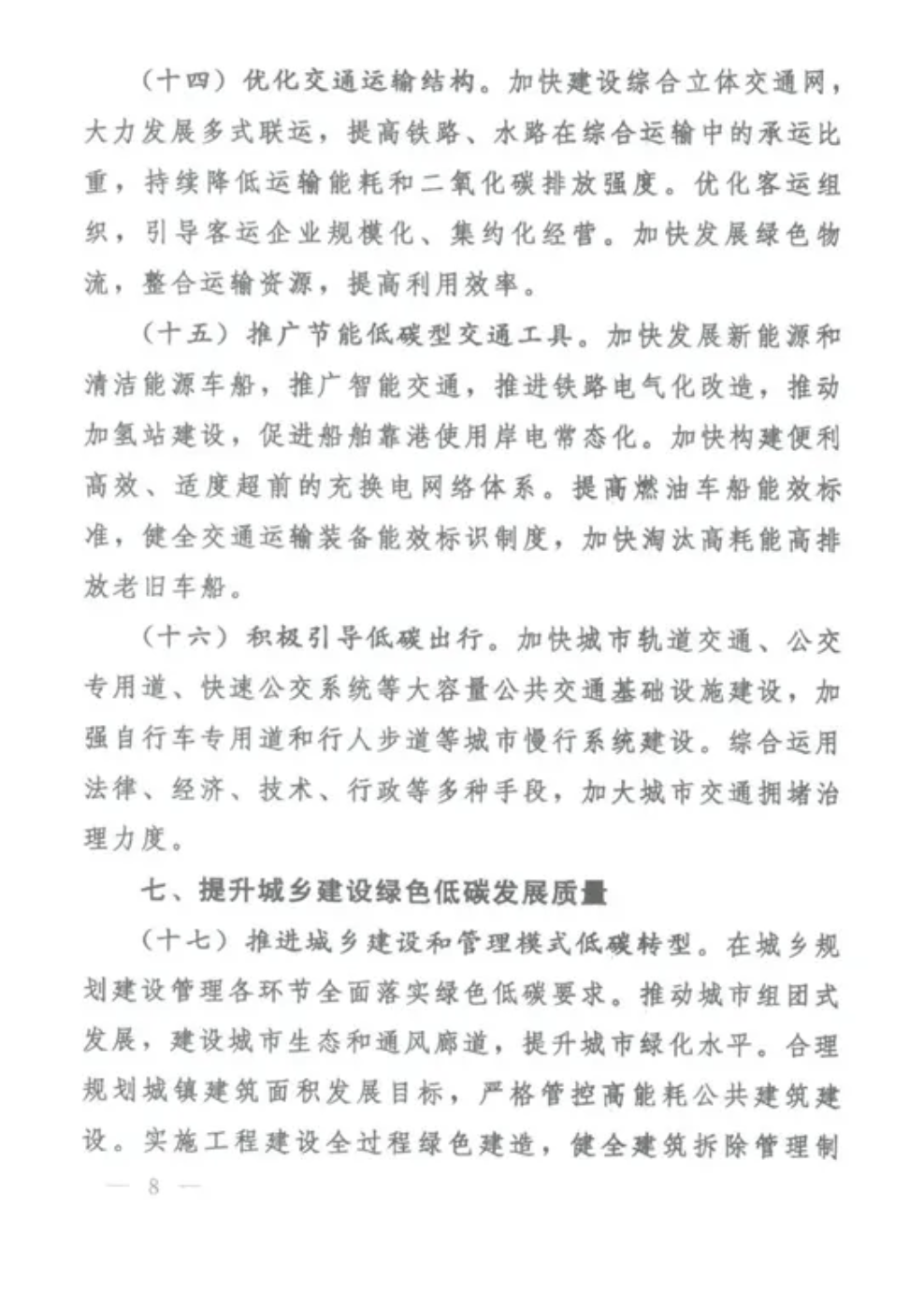 (十七)推進(jìn)城鄉(xiāng)建設(shè)和管理模式低碳轉(zhuǎn)型。在城鄉(xiāng)規(guī)劃建設(shè)管理各環(huán)節(jié)全面落實(shí)綠色低碳要求。推動(dòng)城市組團(tuán)式發(fā)展,建設(shè)城市生態(tài)和通風(fēng)廊道,提升城市綠化水平。合理規(guī)劃城鎮(zhèn)建筑面積發(fā)展目標(biāo),嚴(yán)格管控高能耗公共建筑建設(shè)。實(shí)施工程建設(shè)全過(guò)程綠色建造,健全建筑拆除管理制度,杜絕大拆大建。加快推進(jìn)綠色社區(qū)建設(shè)。結(jié)合實(shí)施鄉(xiāng)村建設(shè)行動(dòng),推進(jìn)縣城和農(nóng)村綠色低碳發(fā)展。