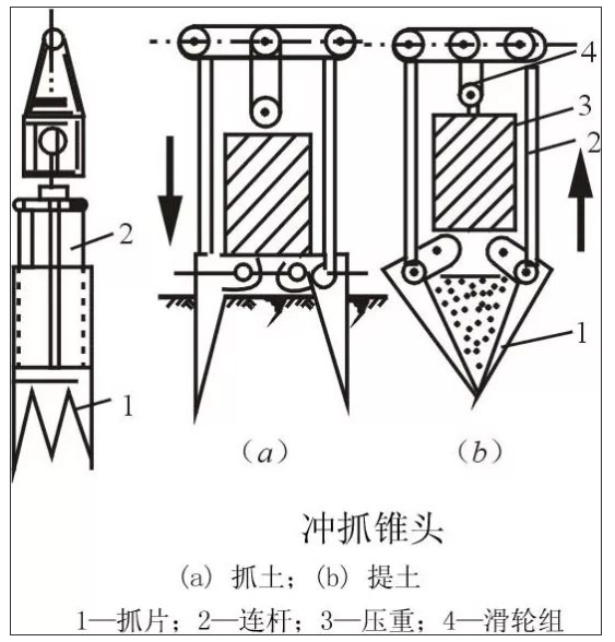 ① 沖抓錐錐頭上有一重鐵塊和活動(dòng)抓片,通過(guò)機(jī)架和卷?yè)P(yáng)機(jī)將沖抓錐提升到一定高度,下落時(shí)松開(kāi)卷筒剎車(chē),抓片張開(kāi),錐頭便自由下落沖入土中,然后開(kāi)動(dòng)卷?yè)P(yáng)機(jī)提升錐頭,這時(shí)抓片閉合抓土。沖抓錐整體提升至地面上卸去土渣,依次循環(huán)成孔。